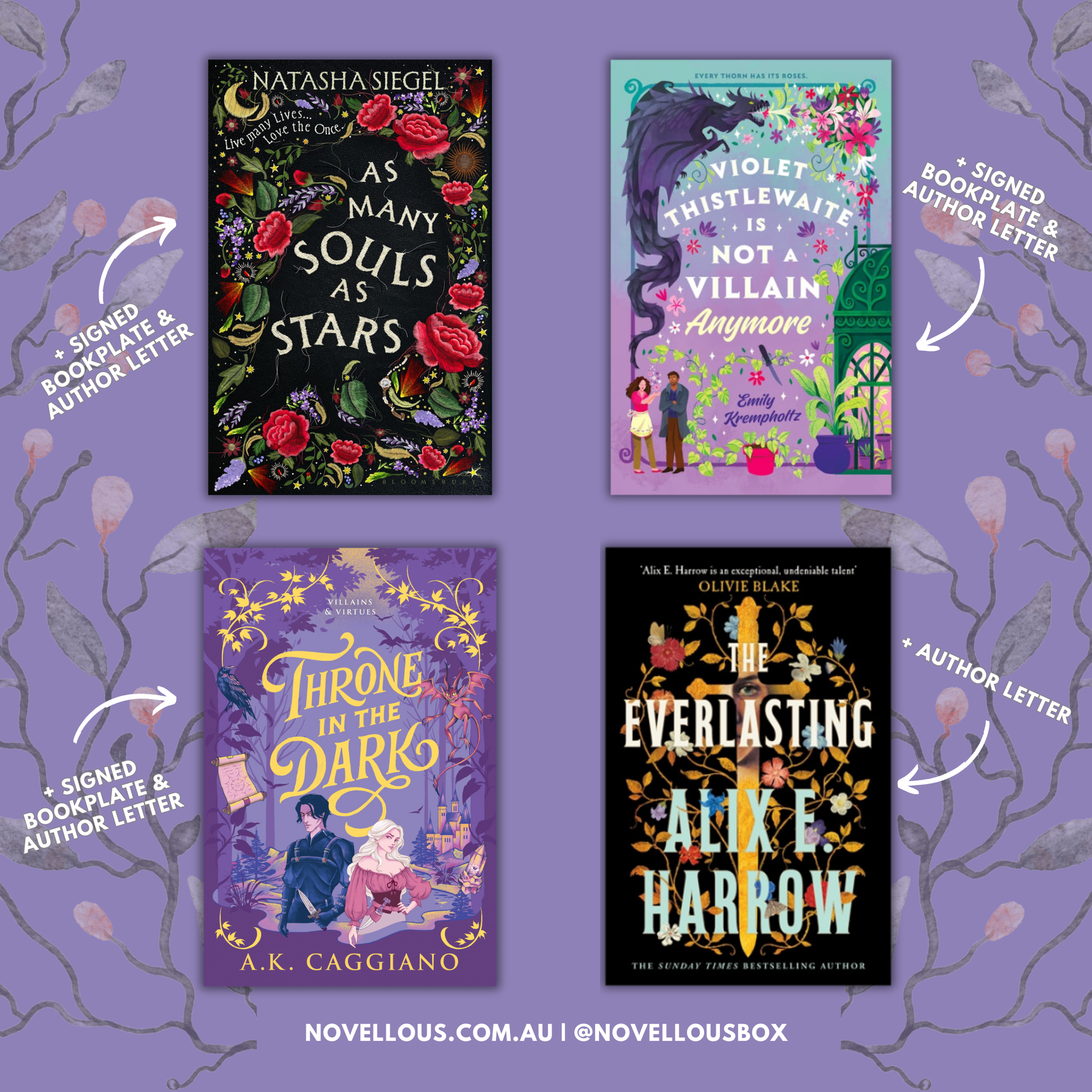 The paperback edition of VIOLET THISTLEWAITE IS NOT A VILLAIN ANYMORE by Emily Krempholtz (RRP $24.99) which comes with an author letter + signed bookplate. This book features a powerful plant witch and a grumpy alchemist who must work together to save their quiet town from a magical plague. Funny, cozy, emotional and redemptive.